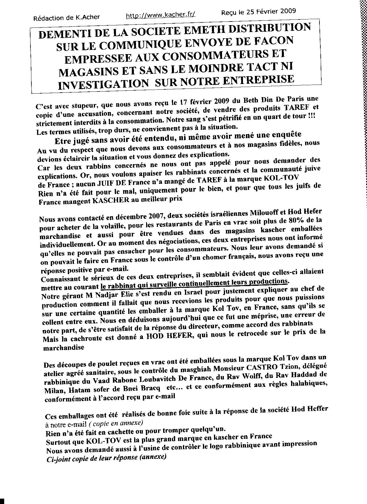 Voici le communiqué reçu de la Maison Emeth