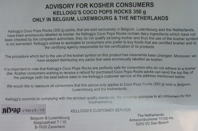 Une circulaire avertit que des douceurs "Pralines au Cognac-Amaretto" de Gianna importées en Israël, surveillés par le Rav Hod sont étiquetés "parve" alors que les services de l'importation du Grand Rabbinat Israélien y ont noté des produits dérivés du lait. Il semble qu'il s'agisse d'une erreur d'étiquetage, et les produits auraient été retirés de la vente en Israël. |