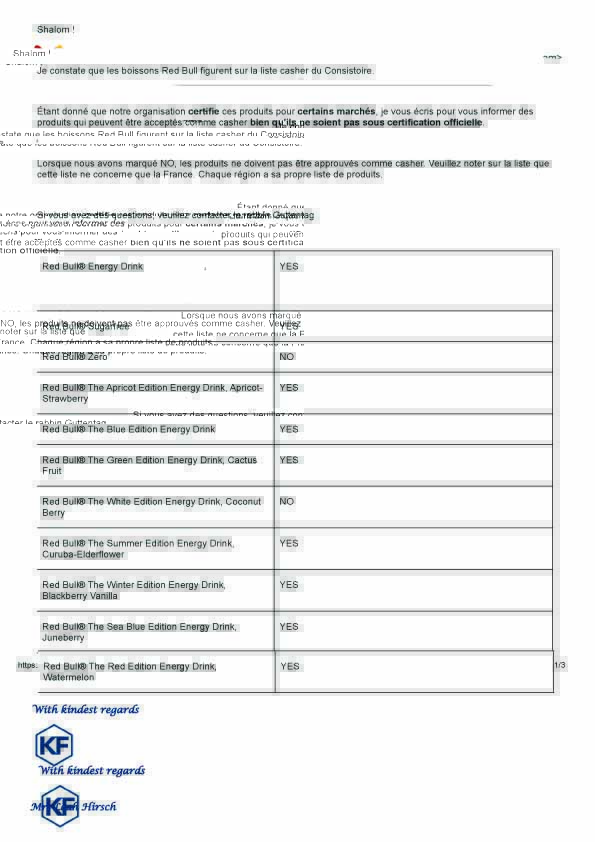 Red Bull: Courrier du KF concernant la cacherouth du Red Bull