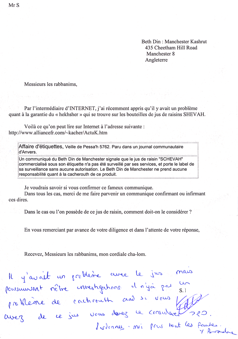 communiqué du Beth Din de Manchester signale que le jus de raisin
