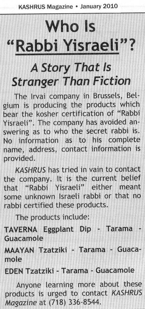 Nous avons attiré l'attention de nos lecteurs dès juillet 2009 à propos de produits fabriqués "sous la supervision du Rav Israeli", en nous interrogeant sur l'existence même de ce rabbin.