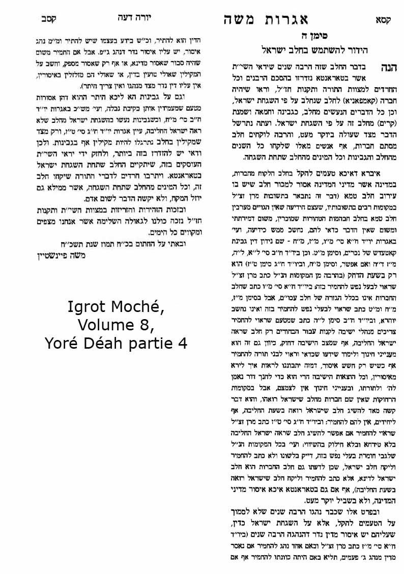 Note de K.Acher: ce texte est postérieur à la permission donnée en 5714 (1954) par le Rav quant au lait industriel (pas les produits fromagers).