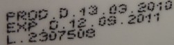 Ou encore un produit semblant être daté du 13.03.2010 avec des anomalies de lecture sur le 3 du 13 pouvant laisser planer un doute. Il se périme le 12.09.2011 soit 18 mois jour pour jour plus tard. | ![]() |