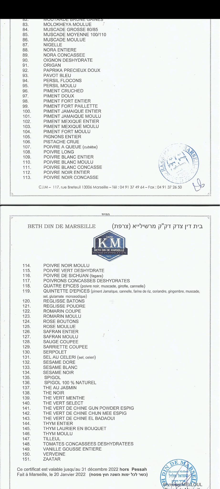 listes, sites et certificats de cacherouth