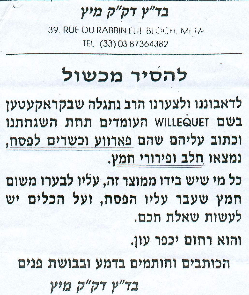 | Voici à titre de comparaison le communiqué le commuiqué qu'avait fait paraître le Rabbinat de Metz dans des circonstances semblables. Il est vrai que c'était un entrefilet en hébreu dans un journal communautaire d'Anvers et paru après la fête de Pessa'h 1998. Voici l'article écrit par un de nos futurs collaborateurs, et qui n'a rien perdu de son actualité... |